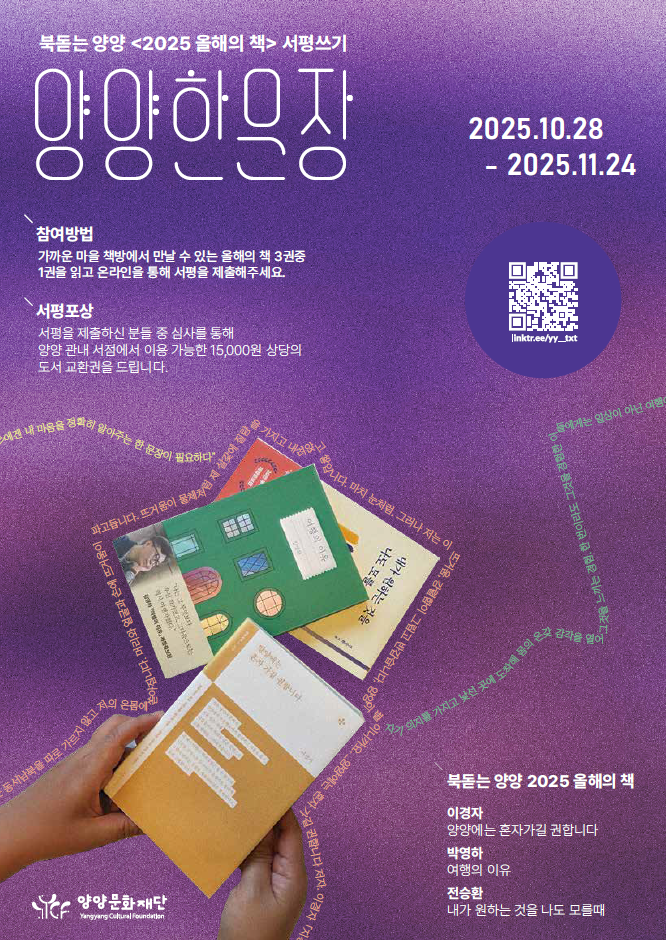 2025 올해의 책으로 선정된 3권의 책 중 1권을 읽고 온라인을 통해 서평을 제출해주세요.심사를 통해 100분께 양양관내 4곳의 서점에서 이용 가능한 15000원 상당의 도서교환권을 드립니다.양양의 사람들이 선정한 올해의 책 서평은 홈페이지를 통해 게시됩니다.