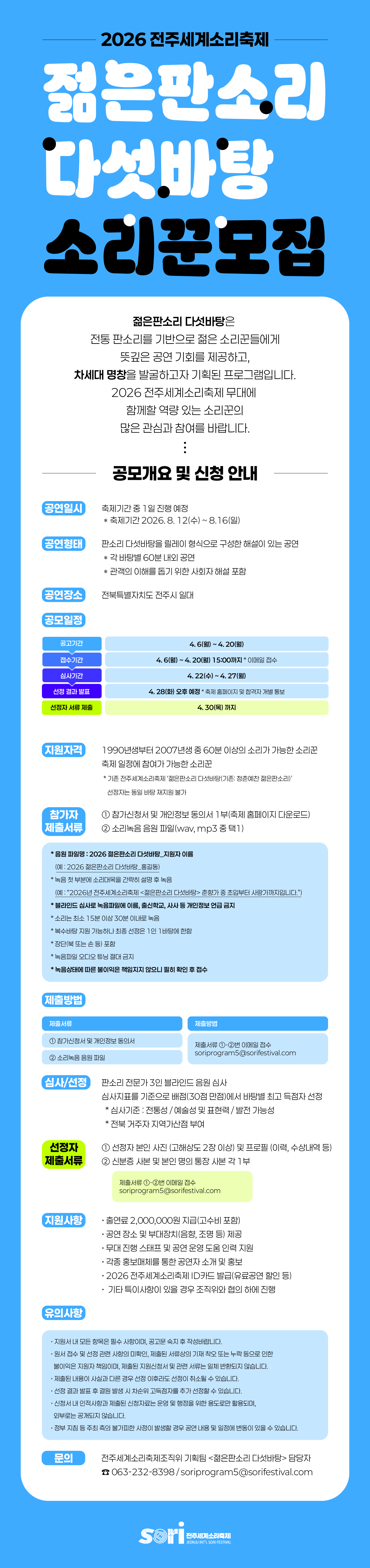 2026 전주세계소리축제 <젊은판소리 다섯바탕> 참가자 모집 홍보