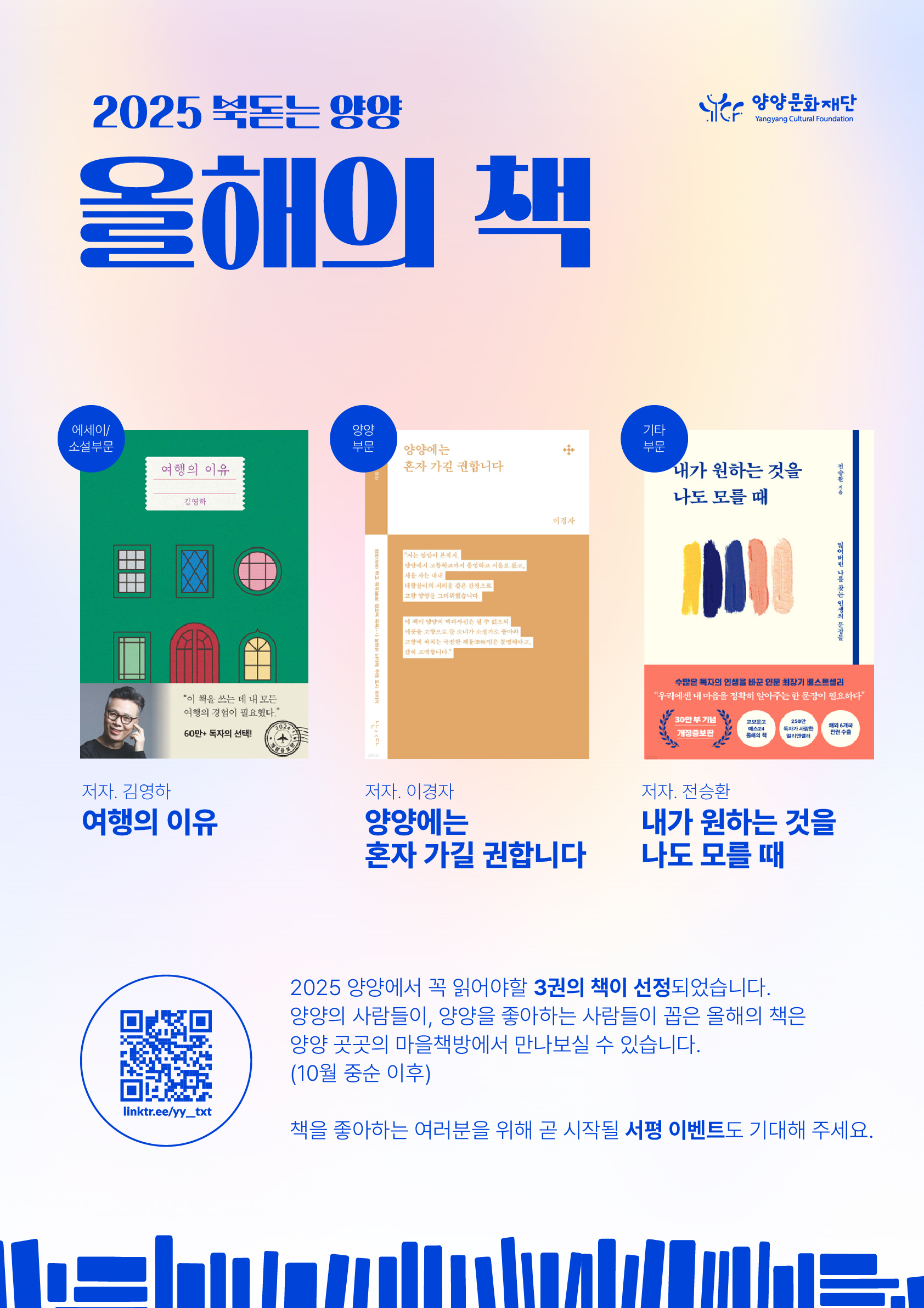 양양군민들의 적극적인 참여로 2025 북돋는양양 <올해의 책> 선정이 완료되었습니다.도서 추천과 전문가 심의 그리고 군민들의 도서추천 투표로 진행된 <올해의 책> 선정에 관심가져 주신 분들께 감사드립니다.