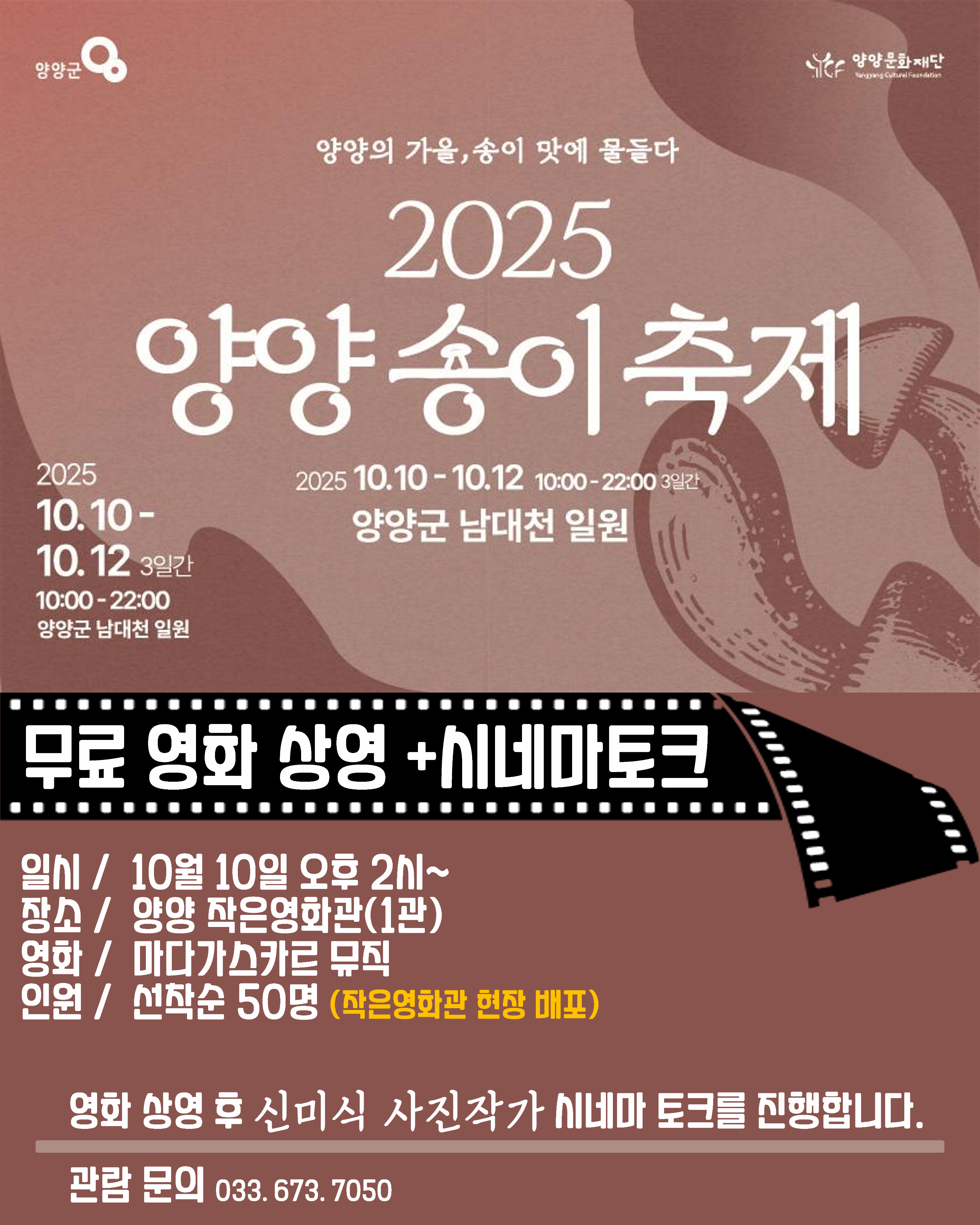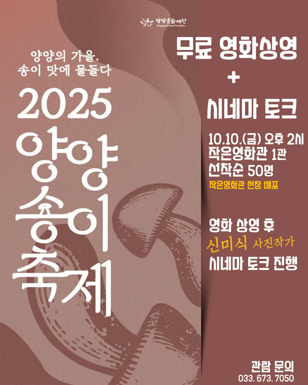 양양문화재단에서 진행중인 (2025 양양 송이 축제) 무료 영화 상영 + 시네마토크(신미식 사진작가)를 소개합니다.